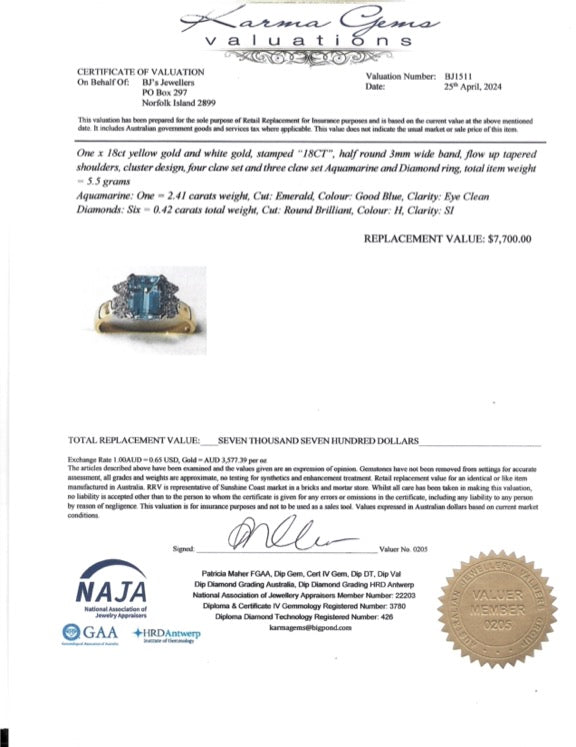 This elegant 2ct Aquamarine ring exudes sophistication and timeless beauty. Set in a lustrous 18ct gold band, the Aquamarine captivates with its deep azure hue, while smaller diamonds on either side enhance its brilliance. Perfect for special occasions or as an everyday statement piece. Certificate of Valuation Included.