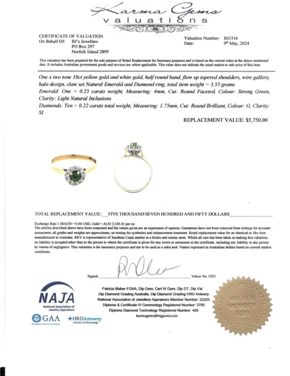 This 18ct ring features a striking green emerald set on a delicate gold band, surrounded by sparkling diamonds. Perfect for adding a touch of sophistication to any outfit. Certificate of Valuation included.