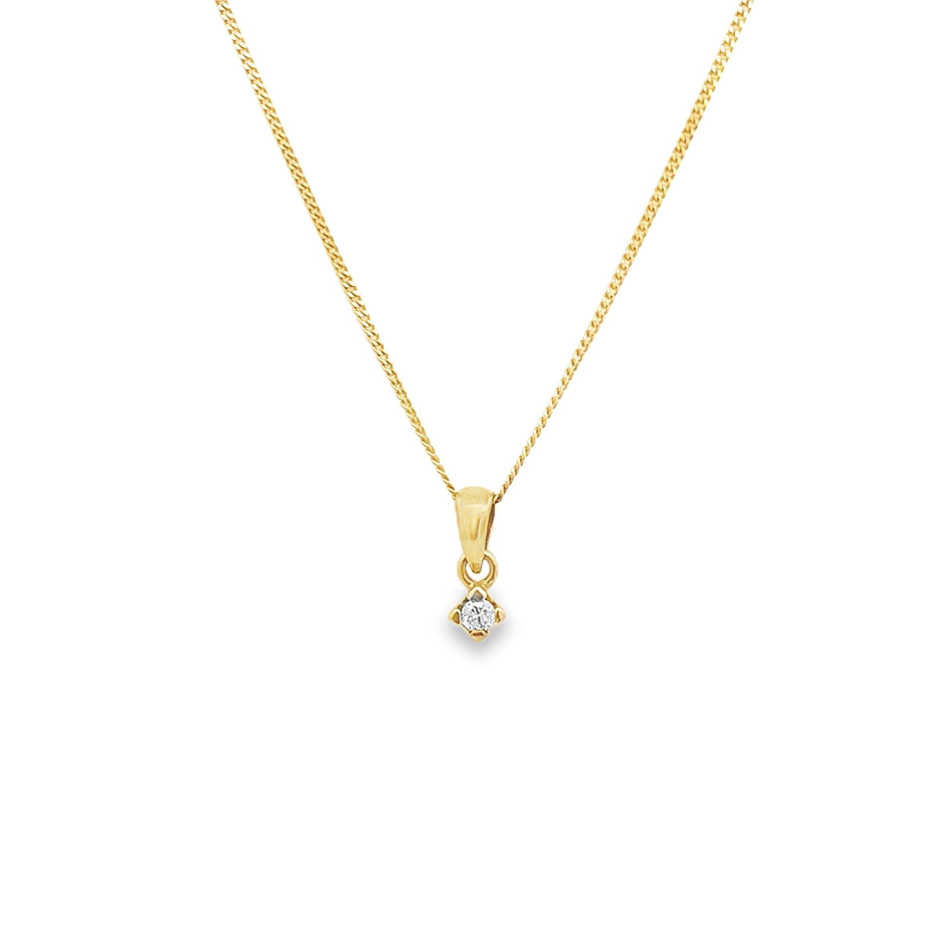 This stunning gold pendant necklace features a delicate sparkling diamond. Perfect for adding a touch of elegance to any outfit, it is a versatile piece that can be worn for both casual and formal occasions. Chain not included.