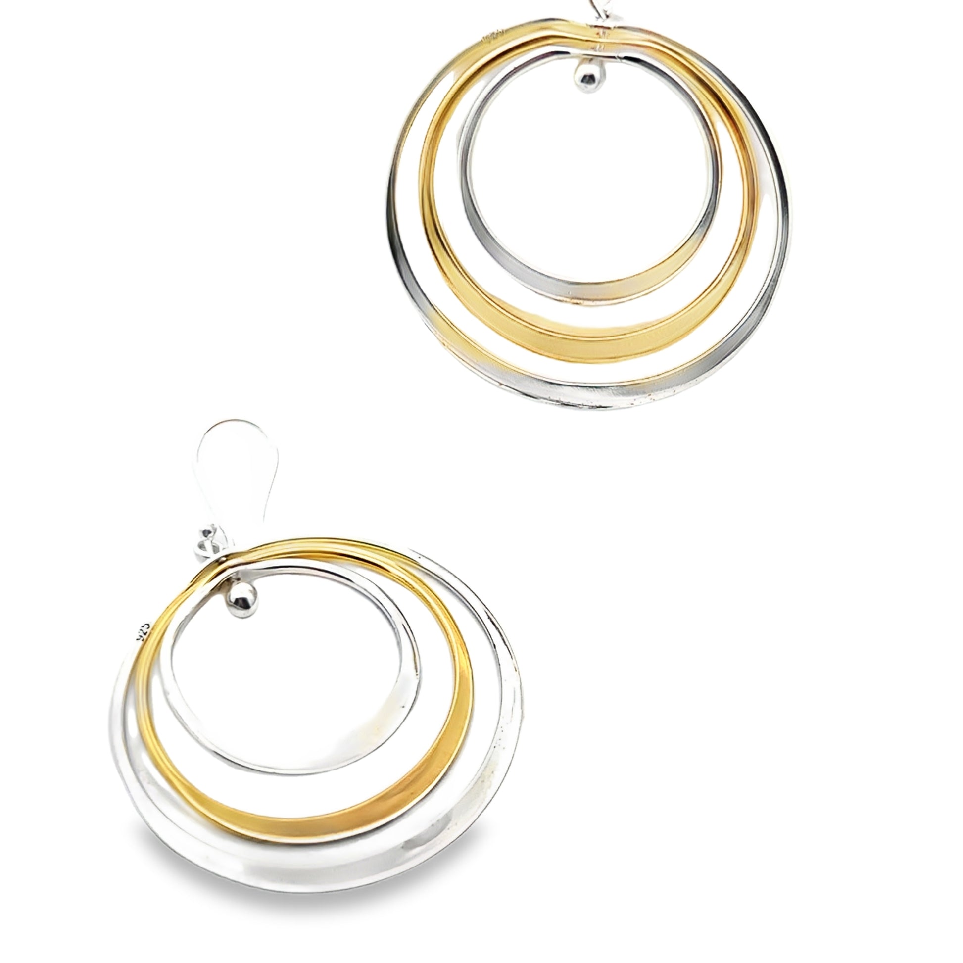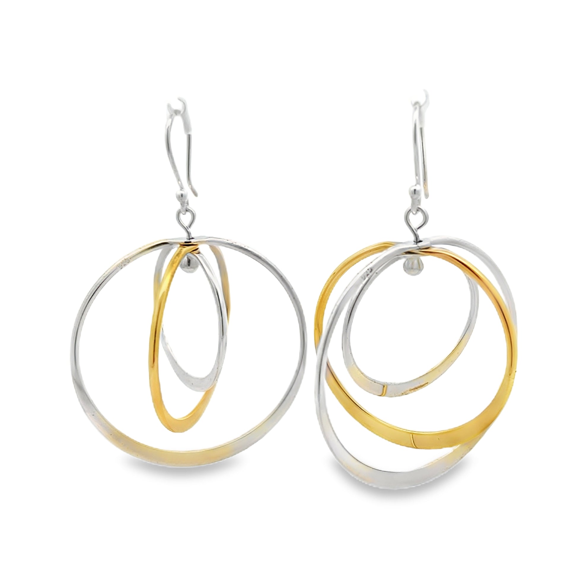 Elevate your style with these stunning dangle earrings, crafted from lustrous silver and gold. The circular design features interlocking rings, creating a captivating sense of movement and depth. Perfect for adding a touch of modern elegance to any ensemble, these earrings are sure to turn heads.