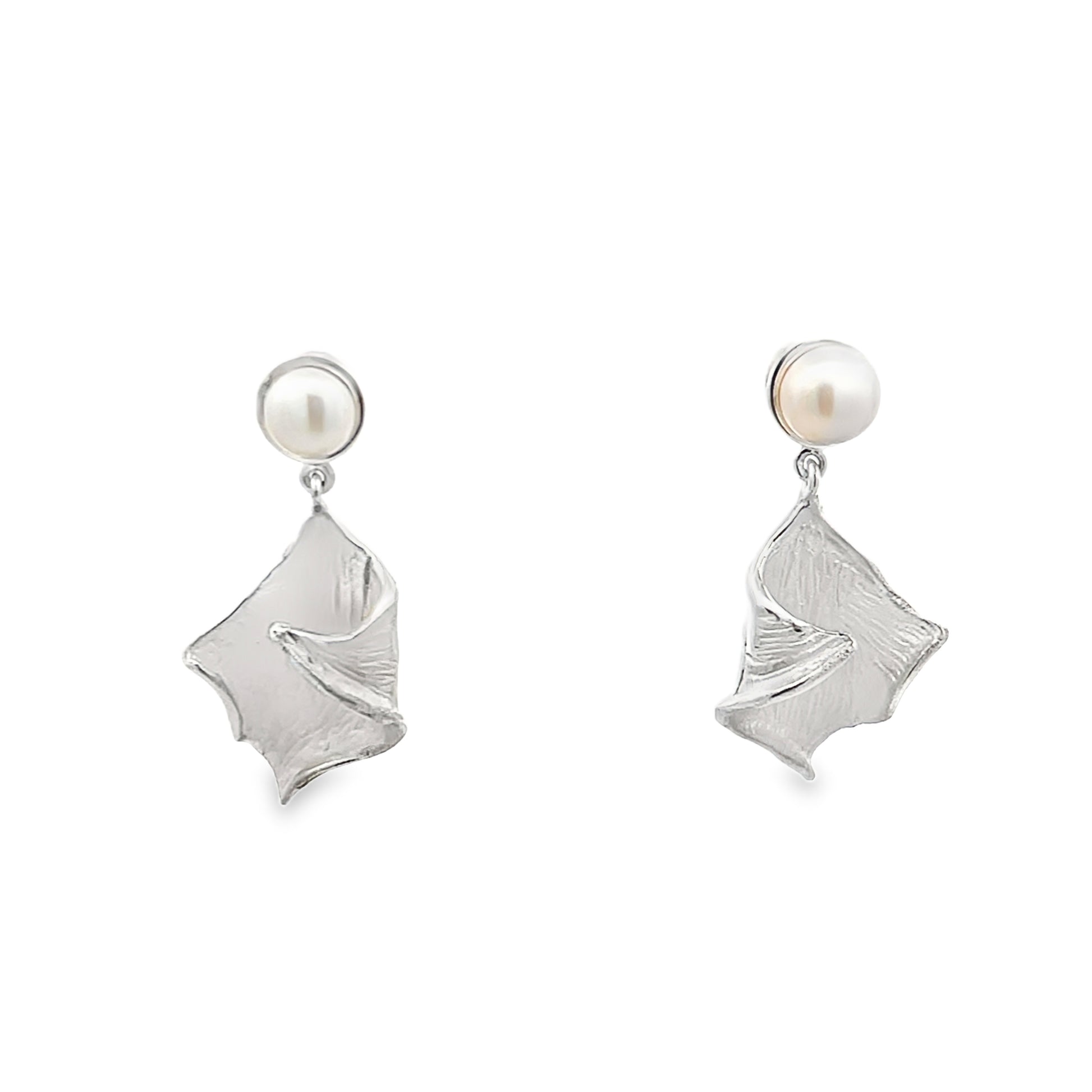Elegantly crafted dangle earrings, featuring luminous, round cabochon-cut pearls gracefully suspended from polished silver fittings. These earrings blend classic sophistication with contemporary design, perfect for adding a touch of refinement to any ensemble. Their distinct style and iridescent pearls make them a timeless accessory.