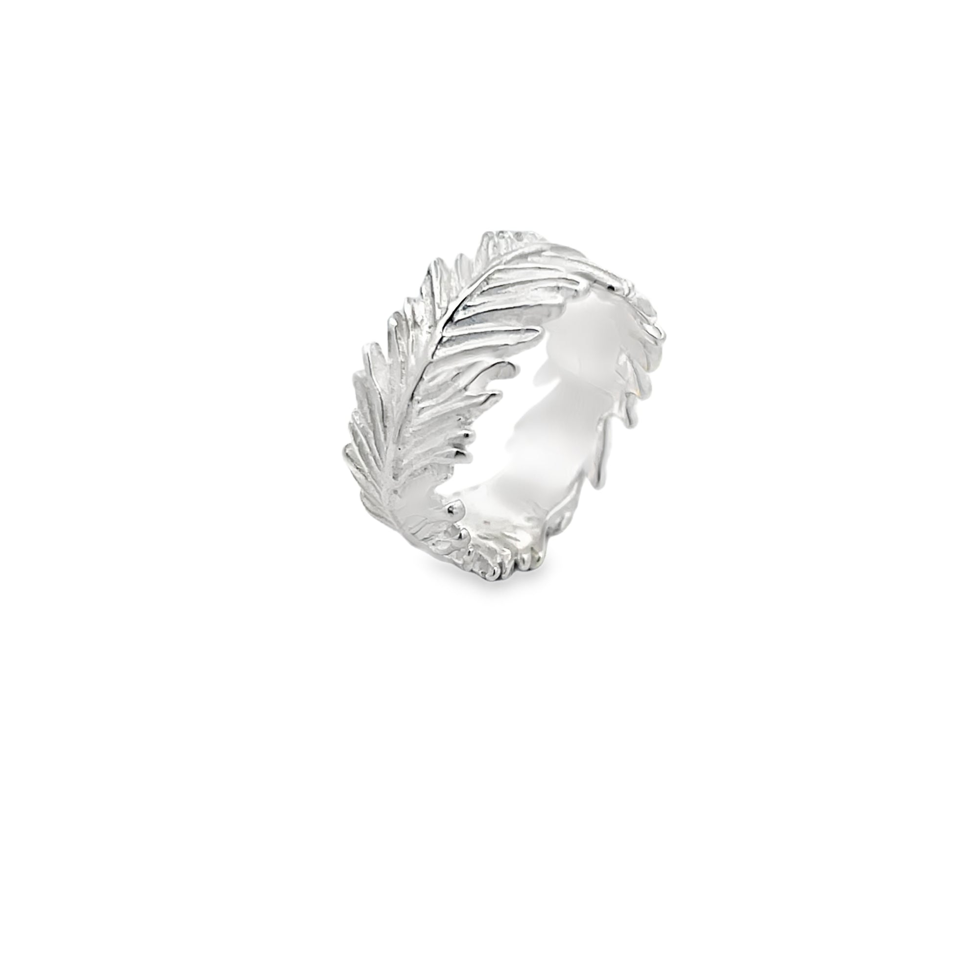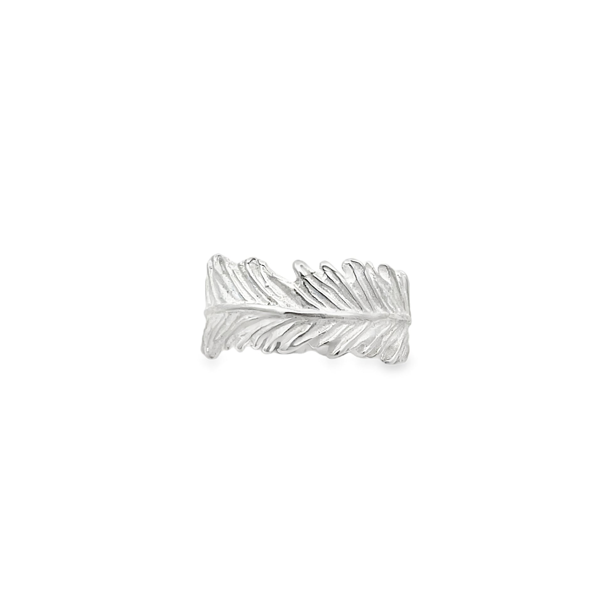 Sterling silver ring featuring an elegant feather design with detailed work throughout. Versatile and durable, perfect for everyday wear or special moments.